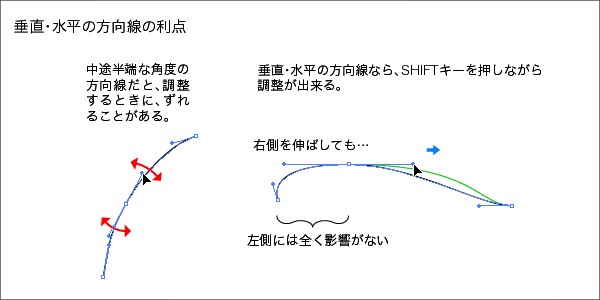 アドビ イラストレーター(Adobe Illustrator)やフォトショップ(Photoshop)でベジェ曲線の方向線を垂直水平や斜め45度に伸ばすと、shiftキーで方向線の片側だけを調整できます。